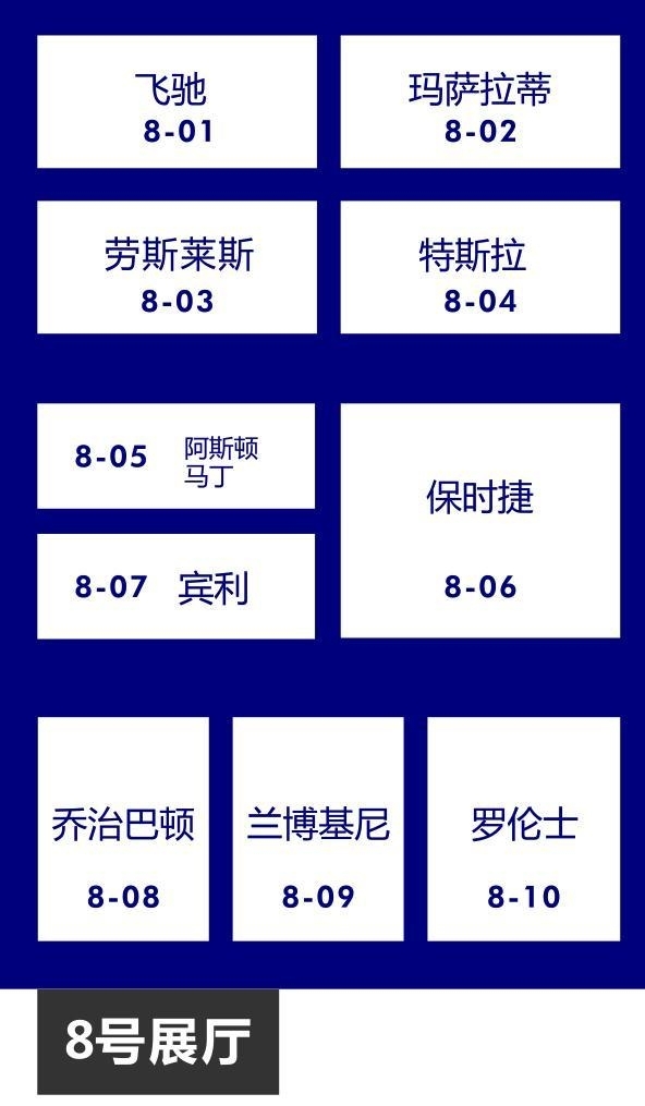 8号馆:劳斯莱斯、宾利、兰博基尼、阿斯顿马丁、保时捷、玛莎拉蒂、特斯拉、乔治巴顿、罗伦士、飞驰、星驰、GMC、冠润、上喆等。