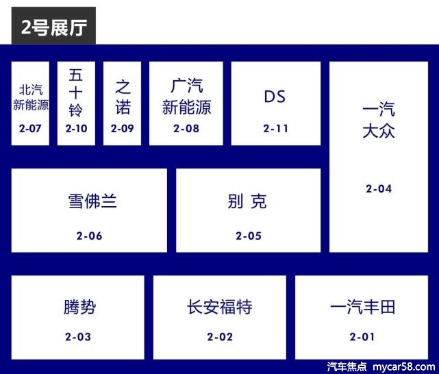 2号馆:一汽丰田、长安福特、腾势、一汽大众、别克、雪佛兰、DS汽车、广汽新能源、之诺、五十铃、北汽新能源等。