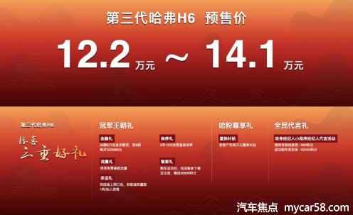 拒绝让消费者为不合理买单,活动现场,长城汽车股份有限公司哈弗品牌营销总经理文飞更用网络流行语“将价格打下来”赢得掌声一片,他公布了第三代哈弗H6预售价格区间及惊喜购车政策,预售价格区间为12.2万元至14.1万元,而包括冠军王朝礼、哈粉尊享礼及全民代言礼在内的三重惊喜好礼,则为新老用户带来了更大优惠。冠军王朝礼包括:36期6万低息定额贷,前6期每月仅还666元的金融礼;6年12次免费基础保养礼;基础流量终身免费的流量礼。如果购车成功,还有智家礼,完成智家下载及注册,将获赠36666智家积分;如果完成了线上预订,还将获得抽奖赢取1吨油的幸运礼。哈粉尊享礼包括:老客户现在购车,可享受至高万元置换补贴。此外,借助哈弗经纪人小程序开展经纪人代言活动,还将享有全民代言礼。推荐有效线索奖600积分,成功购车奖至高60000积分。
