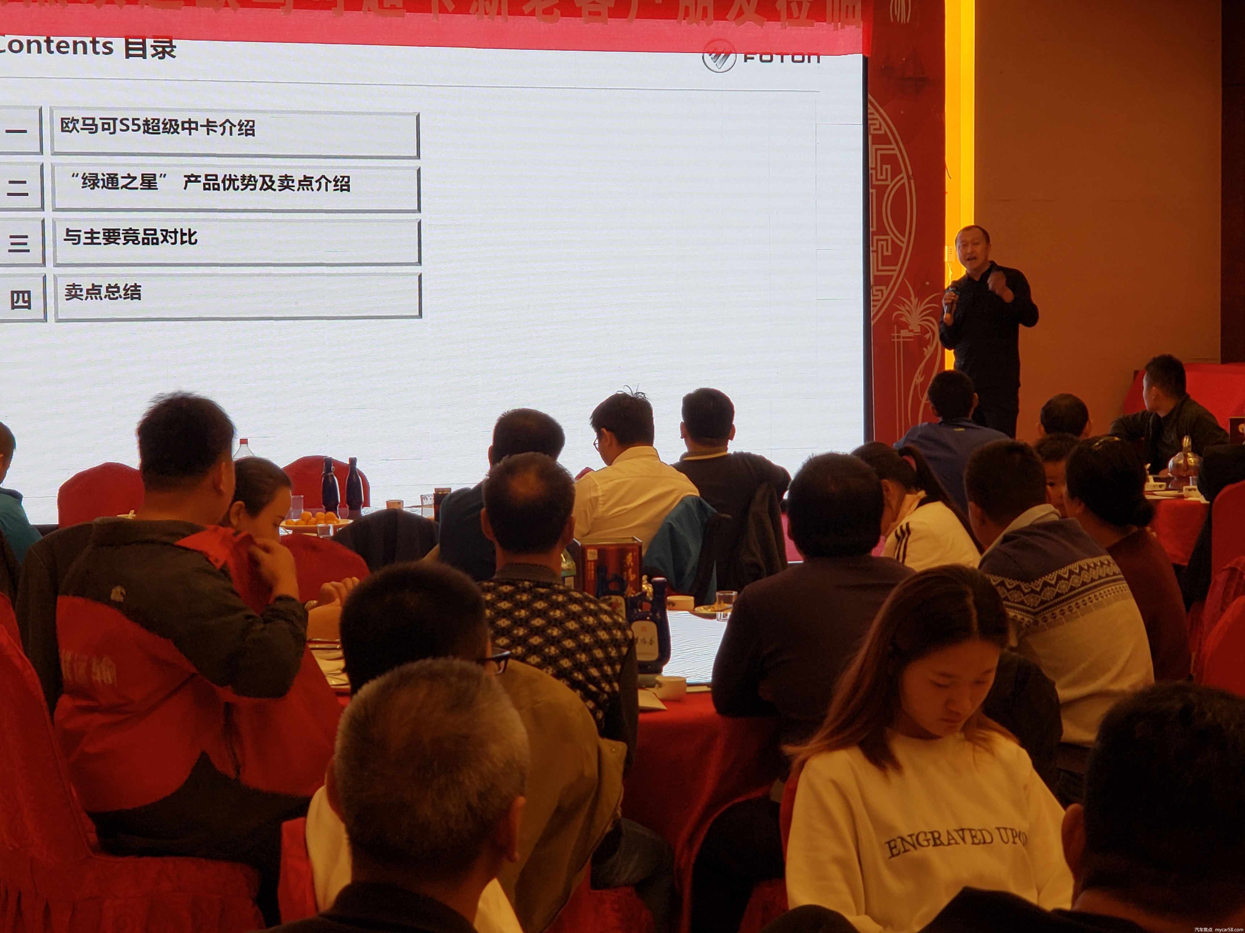 在会议过程中,欧马可山东大区经理王清勇先生就福田欧马可S5超卡产品向各位来宾进行了产品说明。详细介绍了2017年、2018年前半年福田欧马可S5系列产品的销售情况,节节攀高的销售业绩引得在场嘉宾的阵阵喝彩。王总还向来宾们介绍了福田欧马可S5绿通产品目前的车辆配置优势,以及一直以来所取得的骄人成绩。现场获得掌声不断。