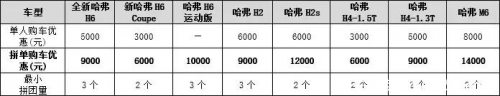 首先,只要用户发起拼团,并将拼团链接发送给亲友,让他们共同参与进来,购买指定车型成功,达到最小拼团量,就可享受每辆车最高1.4万元的拼单优惠。当然,用户也可以直接参加其他亲友发起的拼团。举个例子,假如用户是独自购买全新哈弗H6,仅可享受5000元的购车优惠,但如果和2个亲友一起买全新哈弗H6,那么每人都可以享受高达9000元的购车优惠。(拼单购车优惠详见下表)