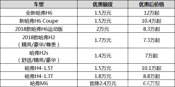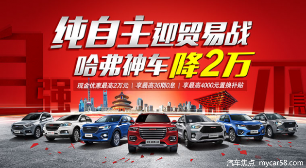 “纯自主迎贸易战,哈弗神车降2万”于9月1日开启,时长为期2个月,10月31日截止。哈弗H系主销车型全新哈弗H6、新哈弗H6 Coupe、哈弗H6运动版、哈弗H4、哈弗H2、哈弗M6都在降价促销之列(详见下图)。其中,哈弗M6官降2.4万,哈弗H6运动版降价优惠2万元,全新哈弗H6和哈弗H6 Coupe优惠1.5万元。