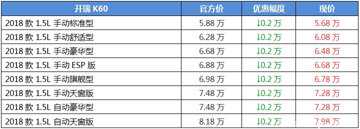 车型概述:2018款开瑞K60的外观造型在前款车型基础进行了细微调整,更多的是配置上的提升,譬如增加了前泊车雷达、ESP车身稳定控制系统、上坡辅助、胎压监测等安全性配置。此外,开瑞K60在驾乘空间和后备箱空间方面都有不错的表现。无论是家用,还是商用,开瑞K60都能满足大部分人的用车需求。