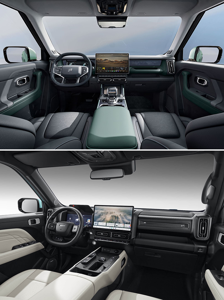座舱部分两款车型所采用的设计理念有异曲同工之妙,都是中控台通过大量横线条进行覆盖,副驾前方均配备有扶手,在越野的时候能保持身体稳定,悬浮式中控大屏以及内嵌式的液晶仪表盘的组合也能确保座舱科技感,并且中岛区域都保留有实体按键旋钮,方便用户随时进行操作。