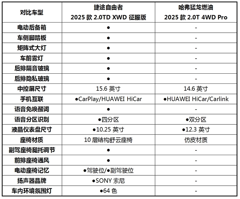 今天我们将选出目前市场热度相当高的捷途自由者2025款2.0TD XWD征服版,以及哈弗猛龙燃油2025款2.0T四驱 Pro,这两款产品来进对比,看看谁才是15万级越野SUV首选吧!