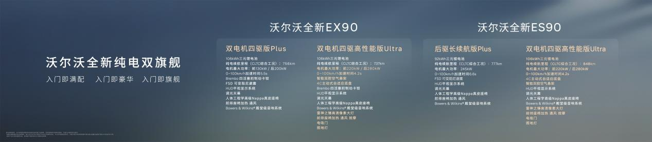 全新纯电旗舰SUV EX90与全新纯电旗舰轿车ES90,不仅传承了沃尔沃的百年安全基因,也是集安全、豪华、驾控三位一体的全能旗舰。基于原生纯电架构SPA2平台打造的两款旗舰车型,遵循全球统一标准、全球统一品质,已在欧洲、美洲、亚洲等多个国家上市,收获全球客户与权威媒体的一致好评。事实证明,纯电时代,沃尔沃依然是出行安全领域的引领者。从燃油时代到电气化时代,沃尔沃汽车用“旗舰之上,再造旗舰”的坚定答案,开启下一个豪华百年新篇章。