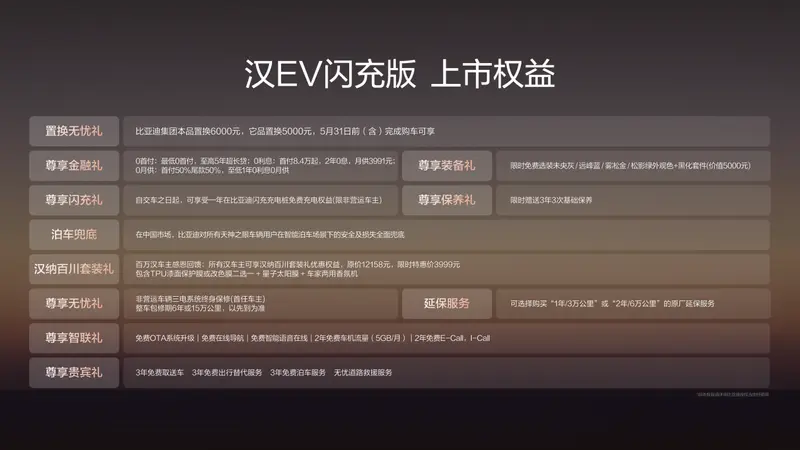 同时,比亚迪还为用户准备了置换无忧礼、1年免费闪充权益、0首付/0利息/0月供任选其一的金融礼、3年3次基础保养、包含3年免费取送车的尊享贵宾礼等共11项权益。针对追求个性的用户,官方推出价值超1.2万元的“汉纳百川”进阶生活套装,限时特惠价仅需3999元。