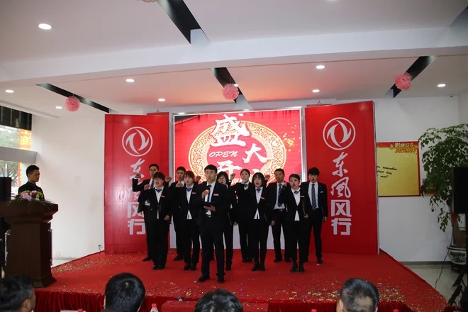红红火火的开业舞台,两侧红幕上的东风风行logo也非常醒目。