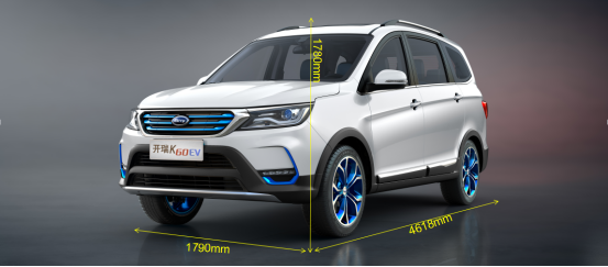 开瑞K60EV的长宽高分别为4618x1790x1780mm,傲视同级车。