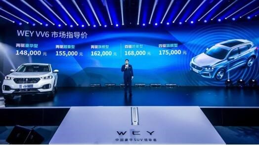 8月27日,在北京竞园WEY品牌旗下的第四款量产车型VV6正式上市,共推出五款车型,两驱豪华型售价14.80万元、两驱超豪型售价15.50万元、两驱旗舰型售价16.2万元、四驱豪华型售价16.80万元、四驱旗舰型售价17.5万元。