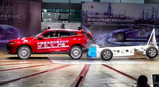 VV7成为中国第一个参考美国最严苛IIHS小重叠碰撞标准进行公开碰撞的车型,最终斩获最优级别“Good”评级;VV5成为中国品牌首个参照美标进行车顶静压测试的车型,并以超过整车重量3倍的的优异成绩,顺利通过测试。WEY P8向美标80公里尾碰发起挑战,在中汽研试验场进行了国内首次公开的插电混合动力车型挑战70%重叠率可变形移动壁障尾部碰撞测试,碰撞结果显示,WEY P8在燃油系统完整性、电安全要求以及总体结果均获得PASS级别,成为中国首款成功挑战美规尾碰的车型。