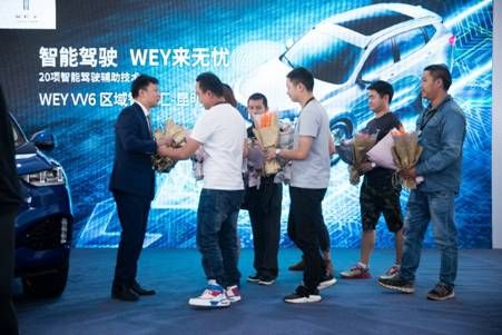 活动最为暖心的在交车环节,两位总经理共同为到达现场的十五位消费者进行交车。这十五位消费者,也正式成为昆明地区首批体验到拥有“智能安全”与“智能豪华”双标签的WEY VV6车主。