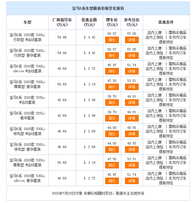 近日,本店内有宝马5系销售,颜色可选,目前购车部分车型可优惠44200元,感兴趣的朋友可以到店咨询购买,详情见下表: