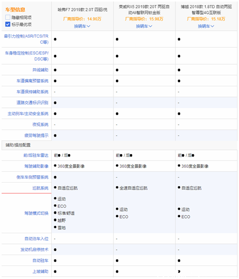 18款博越在主动安全配置方面作了提升,虽然配置也相对齐全,但仅有两种驾驶模式相较于哈弗F7的六种驾驶模式就稍显逊色了。哈弗F7的六种驾驶模式为同级别车型中独有,能适应网友出去郊游时对不同路况的需求。下面我们就选取3个品牌价格相似的3款车型对智能科技配置作下对比,看看谁最具有“加量不加价”高性价比属性。