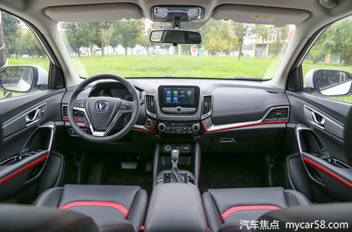 长安CS55内饰同样是黑红搭配的颜色,并采用仿碳纤维的装饰条。8英寸的悬浮式中央屏幕,对于整个中控台视觉效果的提升明显,加上智能手机式的界面设计,菜单分类也比较清晰,值得称赞。