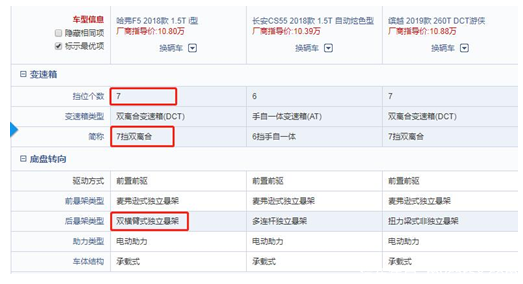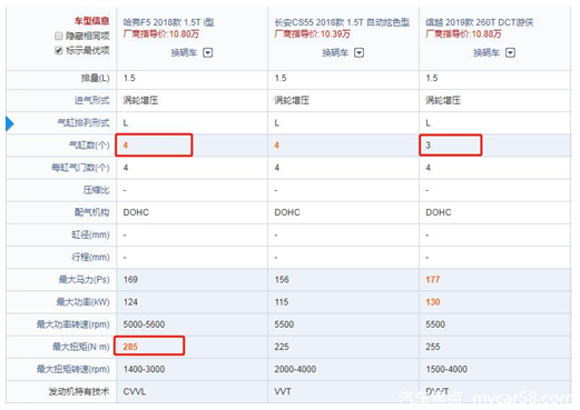我们选的哈弗F5、长安CS55和吉利缤越三款对比车型,都是10万级别的车,且三款车均搭载1.5T动力。首先让我们通过账面数据对比,看到三款车在动力方面的差异。
