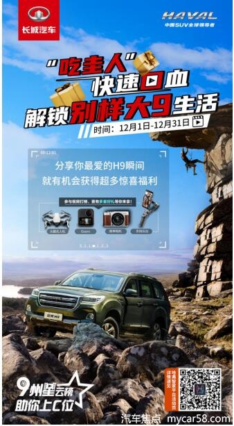 九州星云榜,助你上C位,本次活动截止时间为12月31日,趁现在冬阳正好,雪趣横生,还在等什么?快快拿起相机拍出哈弗H9的飒爽身姿,参与活动赢取超值大奖,大九车主的快乐就是这么简单!
