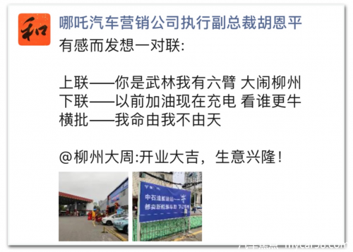 在加油站内卖不加油的纯电动汽车,这恐怕是中国头一遭,而且是在上通五的大本营柳州,莫非这里将上演一幕“神仙打架”的好戏,令人浮想联翩。难怪哪吒汽车营销公司执行副总裁胡恩平在其朋友圈发了一则恭贺开业的信息,并付了一则对联:“你是武林我有六臂大闹柳州,以前加油现在充电看谁更牛“,横批:”我命由我不由天“。
