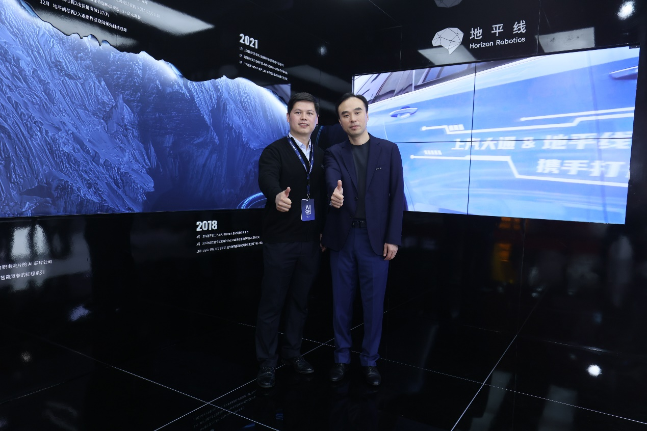 图 1地平线副总裁兼智能驾驶产品线总经理张玉峰(左)和上汽大通技术中心副总经理谢铭诗(右)在地平线展台参观合影