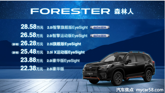 作为斯巴鲁在华销售的主力车型之一,2021款森林人改款之后共推出6款车型,价格区间为22.38-28.58万元。相较于现款,新款森林人增加了2.0i X运动版EyeSight及2.0i旗舰版EyeSight两个车款,全系满足国家第六阶段机动车排放标准。