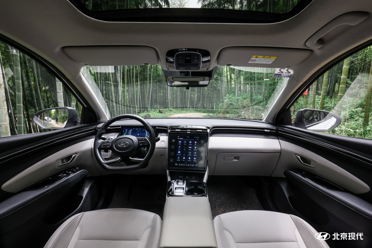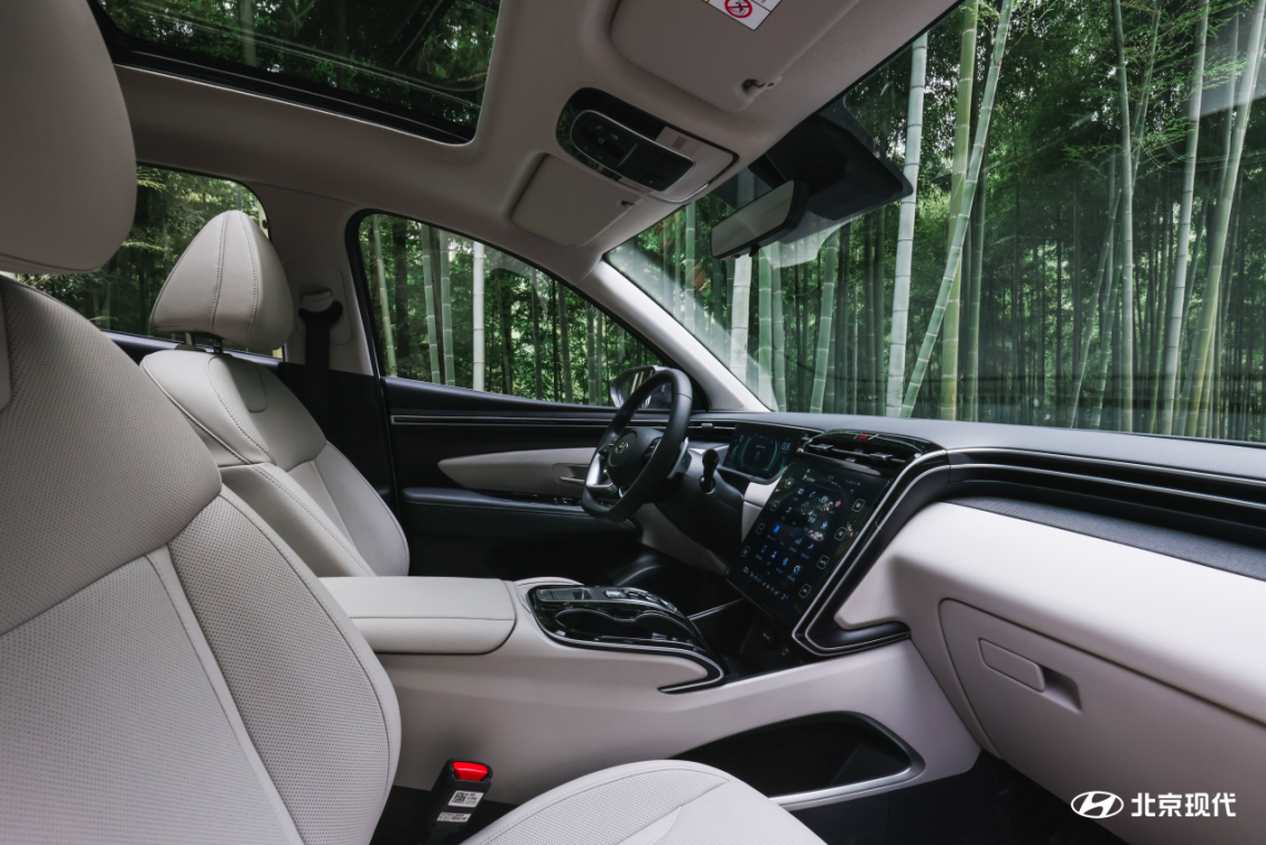 内饰造型方面,第五代途胜L所采用的环抱式内饰设计也是提升空间利用率的方法之一。驾驶者坐入车内,首先映入眼帘的是银色镀铬条从车门两侧汇聚至中控屏上方,10.4英寸的触控显示屏似顺流而下的瀑布自然地放置在座舱中央,营造出丰富的空间及视觉层次,配合宽敞的乘坐空间共同组成“飞瀑环抱座舱”,为用户带来了舒适宽敞的驾乘空间。