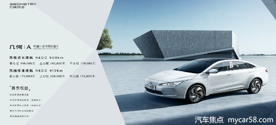 几何A全系共有410公里和500公里两种续航版本,按续航能力分别配置3款不同配置车型,厂商指导价21-25万元,在享受综合补贴后,售价区间为15-19万元。