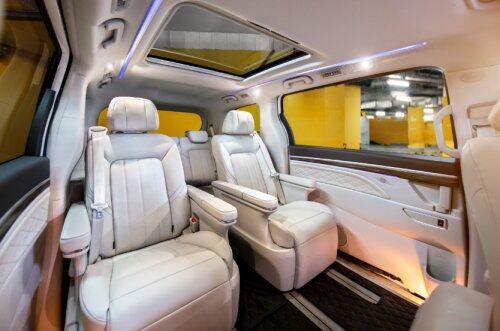 出门在外,它就是一间专属“VIP私人移动会所”。 新车的二排豪华座舱,采用高级雾化隐私玻璃,分隔驾驶舱和后排空间;全新星空顶玻璃天幕设计,将星空装进车里,让后排贵宾能享受到满天繁星。加上34寸智能高清电视、智能冰箱、高质感小桌板等豪华配置,无论是车上办公还是休闲娱乐,都非常方便。