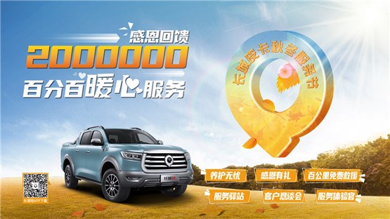 10月16日至12月31日,以“两百万感恩回馈 百分百暖心服务”为主题的长城皮卡秋冬服务节活动开启,持续为车主“送温暖”。依托遍布全国的服务网点和长城炮APP,长城皮卡全系车型(含长城炮和风骏全系车型)用户可享受“养护无忧”、“感恩有礼”、“免费救援”、“服务体验官”等多项暖心服务。