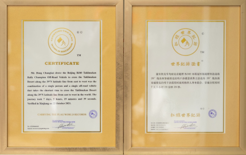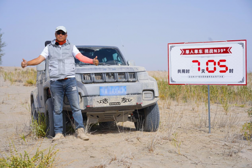 而董长凯驾驶全新一代BJ40环塔冠军版成功穿越N39沙漠的壮举也在10月22日被“扛旗世界纪录”正式收录,成为“世界上沿北纬39°线东西穿越塔克拉玛干沙漠用时最短的单人单车组合”。