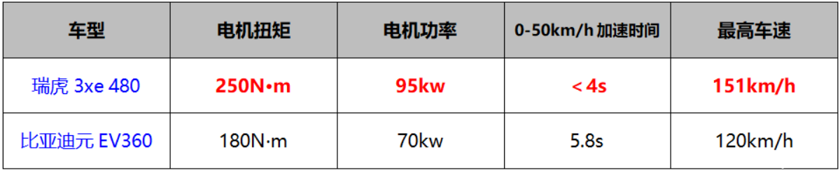 先来看看电机性能,瑞虎3xe 480搭载一台高效永磁同步电机,电机扭矩高达250N·m,电机功率为95kw,出色的电机性能使得其最高车速可达到151km/h,0-50km/h加速时间仅需4S以内。比亚迪元EV360的电机扭矩只有180N·m,电机功率70kw,0-50km/h加速需要5.8秒,最高车速也仅有120km/h,对比明显。