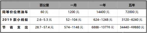 进一步计算,燃油车每周以500公里计算燃油费支出300元,而2019款小蚂蚁每周耗电费用仅需13元~26元,相比燃油车每周可节省支出最高287元;一个月便是574元;一年竟可以节省6888元的出行成本,相当于一台手机的价格。