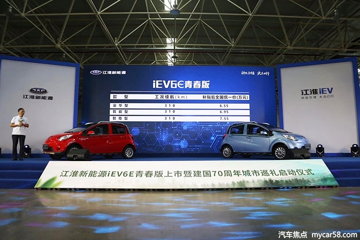 8月27日,江淮iEV6E青春版在安庆新能源生产基地焕新上市,共推出豪华型、智能型及智尊型三个版本,补贴后售价为6.55-7.55万元。值得一提的是,为庆祝建国70周年,消费者凡在9-10月购买江淮新能源全系车型尊享献礼价,最高立省6000元,并可获赠超值大礼包。