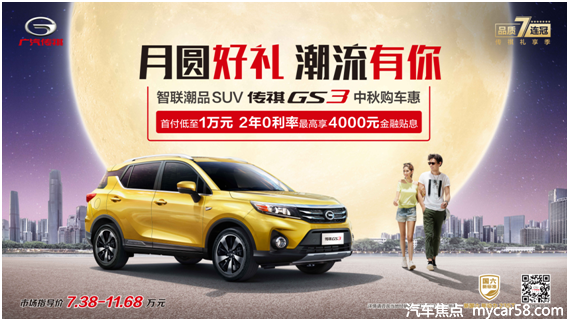 近几年买车主力人群越来越趋于年轻化,外观时尚、操控灵活、舒适实用的精品小型SUV更容易获得90后年轻群体的青睐,颜值和实力并存的传祺GS3成为小型SUV最火车型。中秋小长假来临之际,智联潮品SUV传祺GS3,只要首付1万元即可喜提爱车,正是喜欢小型SUV青年车主的购车良机。