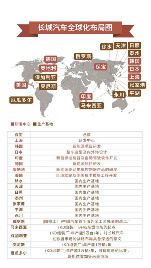与此同时,长城汽车全球化研、产、销布局也逐步完善。长城汽车已先后在日本、美国、德国、印度、奥地利和韩国设立海外研发中心,构建出以保定总部为核心,涵盖欧洲、亚洲、北美的全球化研发布局。而包括俄罗斯图拉工厂及重庆智慧工厂在内的5个已经投产的整车工厂,与江苏张家港、山东日照、浙江平湖、江苏泰州等地在建的全工艺整车生产基地,以及分布在“一带一路”沿线的5大KD工厂一起形成“9+5”的全球化生产体系。销售网络方面,长城汽车海外网点总计超500余家,网络覆盖俄罗斯、南非、澳大利亚及中东、非洲、南美、亚太等区域市场。