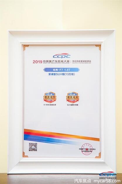 今年8月底,在2019中国量产车性能大赛(CCPC大赛)克拉玛依富城能源站13万级紧凑型SUV组的比赛中,哈弗F7收获满满,两度登上冠军宝座,荣膺“0-400m加速比赛”冠军,“SUV越野计时赛”冠军。