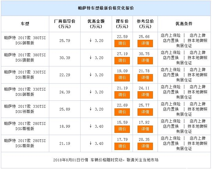 近日,本店内有帕萨特销售,颜色可选,目前购车部分车型可优惠3.20万元,感兴趣的朋友可以到店咨询购买,详情见下表: