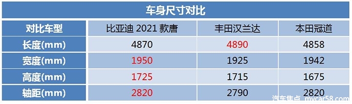 作为一台中型七座SUV,2021款唐长宽高分别为4870/1950/1725mm,轴距达到2820mm,保证了车内每一排座椅都能拥有舒适的纵向空间体验。从车身尺寸来看2021款唐稳居中型SUV的一线水准,即使将其与合资品牌热门选手汉兰达作对比,也几乎是全面领先。