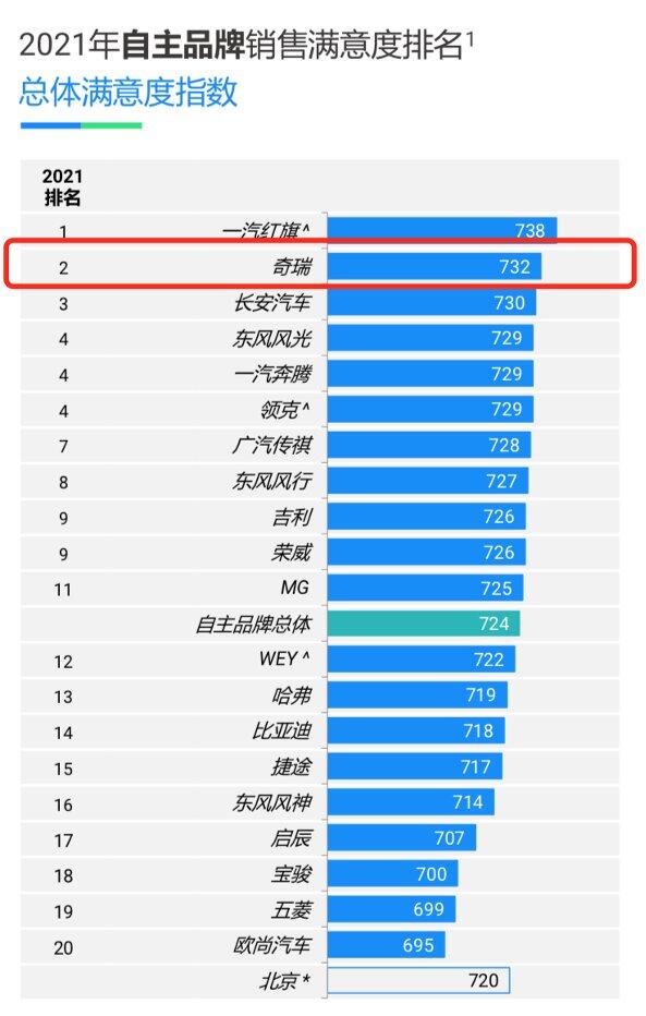 近日,J.D. Power正式发布2021中国汽车销售服务满意度研究(SSI),在2021自主品牌销售满意度排名中,奇瑞以732分斩获亚军。这是J.D. Power连续第22年在中国市场开展汽车销售满意度研究,该研究重点评测了拥车期为2至6个月的新车车主对购车体验的整体满意度。