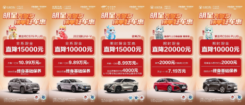 五龙送福,开工福利继续走起。即日起至2月29日,第三代CS75PLUS全系现金直降15000元,龙年开新价10.99万元起,0首付、0月供、0利息;2023款UNI-V全系现金直降10000元,开新秒杀价9.89万元起;Z6现金至高直降15000元,龙年开新一口价8.99万元起;逸动PLUS畅享版、尊贵型,现金直降20000元,再享2000元龙年开新限时红包,一口价7.19万元;第三代CS55PLUS现金直降10000元,再享春节限时红包2000元。