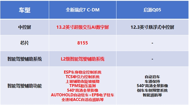 再看启源Q05,其配备12.3英寸悬浮式的中控车机屏幕,支持语音控制、远程控制等互动方式,具备一定的科技感。主动安全方面,搭载自动泊车、车道保持、智能巡航等功能,为驾驶提供基本的辅助。相比之下,全新瑞虎7 C-DM在各项配置的诚意上都要更足。