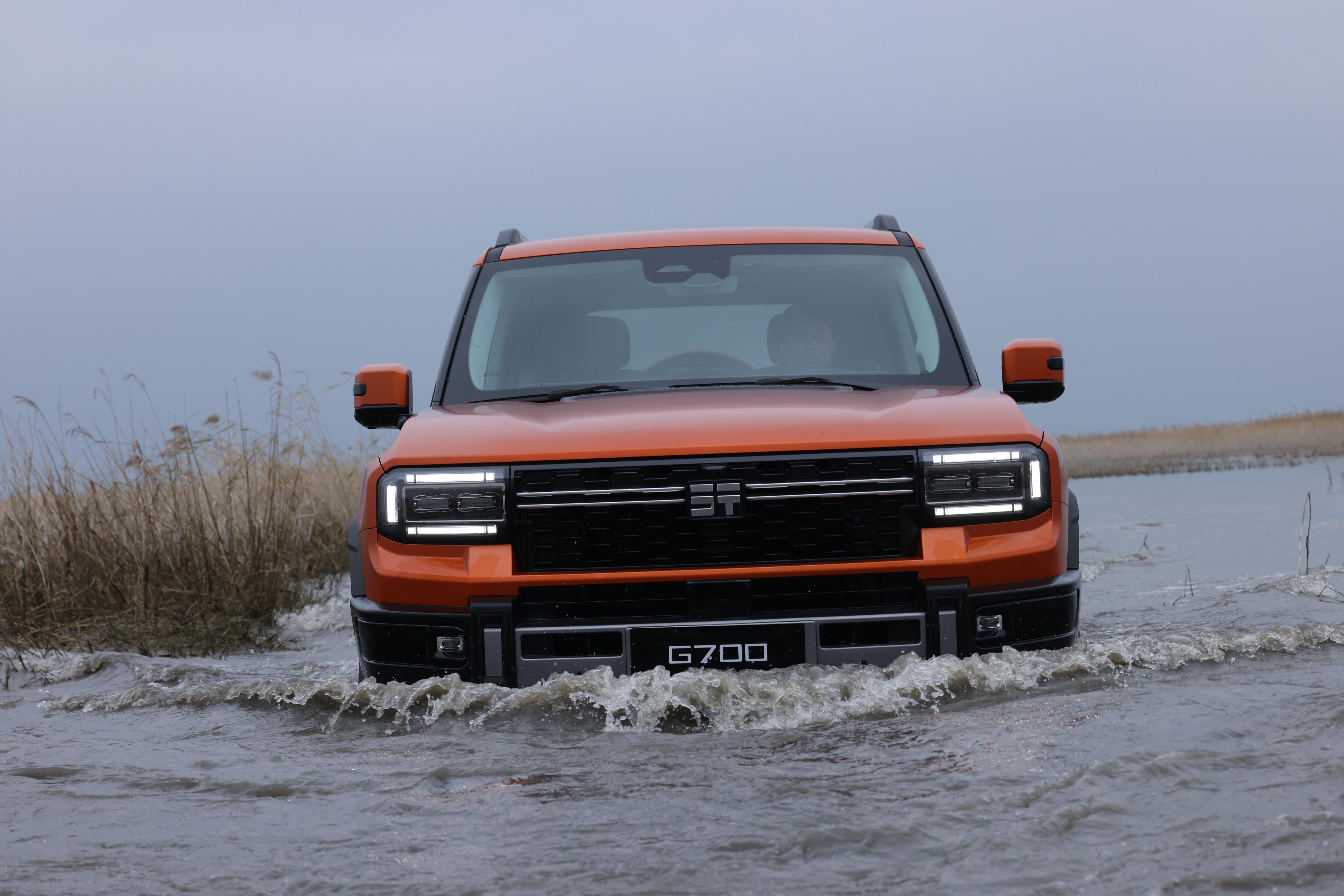 涉水环节更显硬核。当G700驶入600mm深的模拟河道,IP68级防水的发动机、电池与电机全程稳定输出,行业首创制动盘清洁功能自动激活,出水后制动力无丝毫衰减。从容的涉水表现,源自G700防水技术的突破性进阶,其首搭的2.0TD混动专用发动机通过五大防水技术升级,达到同级别第一的IP68级防水,在水中浸泡2小时后仍然可以正常启动,是国标要求浸水30分钟时长的四倍;整车涉水能力在空悬状态下达到970mm,达到路虎揽胜(涉水深度900mm)、路虎卫士OCTA(涉水深度1000mm)等百万豪车水平。