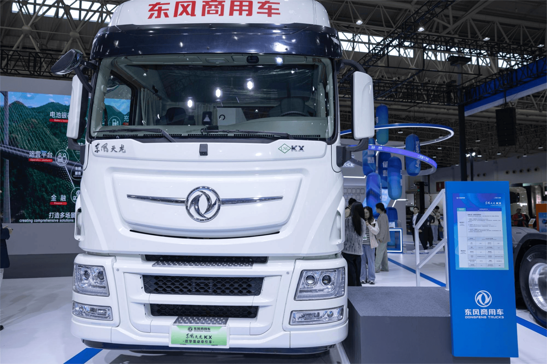 一旁的东风天龙KX双擎混动牵引车则展现场景适配能力,通过智能感知系统完成坡度自适应制动,印证了“安全与经济共生”的研发理念。