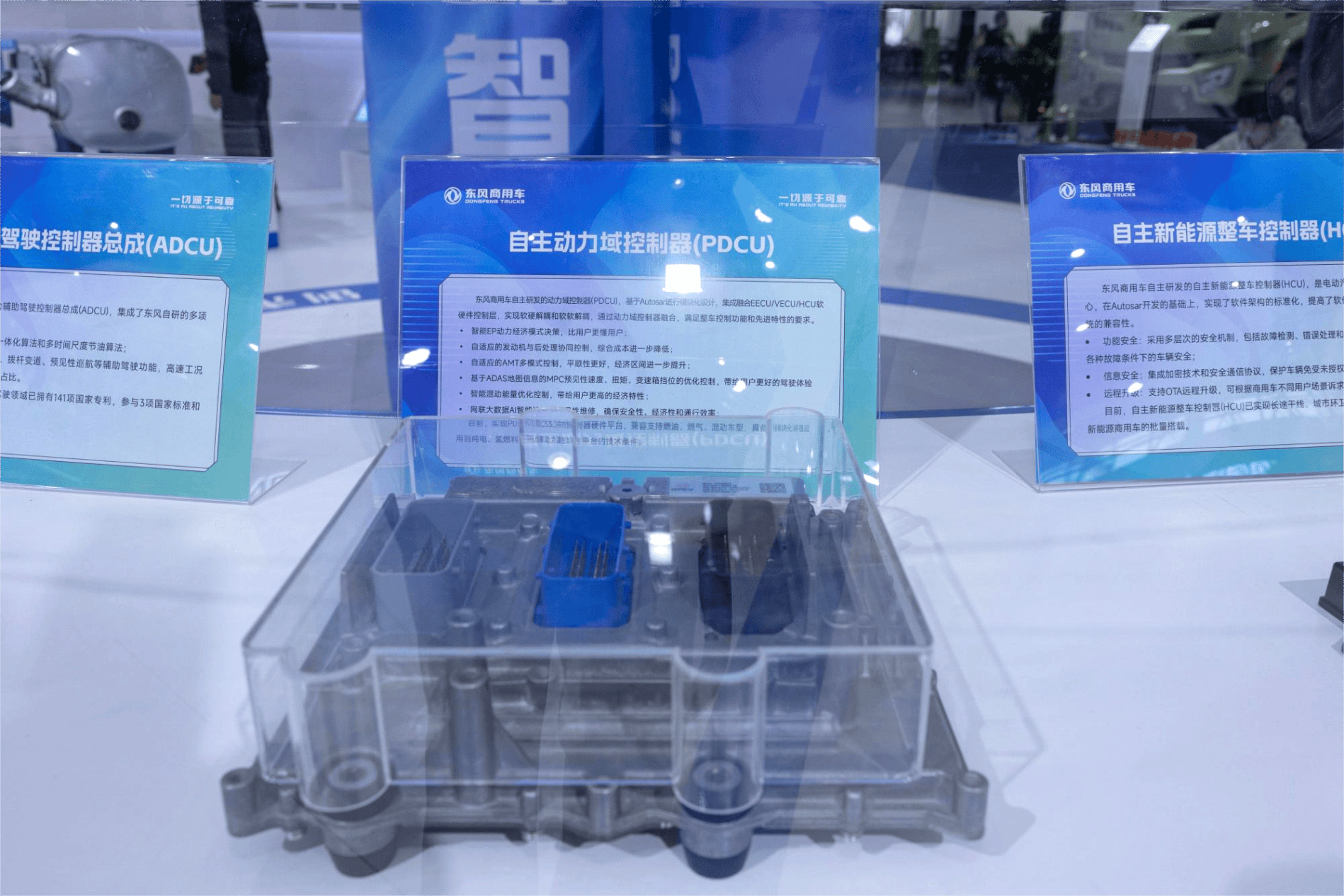 核心部件区的智能驾驶控制器总成更显技术底气:集成感知融合、多时间尺度节油等自研算法,障碍物识别率超99%,配合动力域控制器PDCU的“三域融合”技术(EECU/VECU/HCU),实现发动机与变速箱的智能协同,燃油效率再升3-4%。