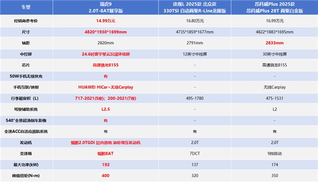 多人出行需要大空间,多元出行需要高智能相伴,多场景复杂路况需要高性能体验。如今,自主、合资百花齐放,谁能在15-20万这一购车区间内给出更好的选项呢?接下来,我们就盘一盘瑞虎9 2.0T-8AT耀享版(以下简称:瑞虎9)、途观L 2025款 出众款330TSI自动两驱R-Line龙耀版(以下简称:途观L)、昂科威Plus 2025款 昂科威Plus 28T 两驱白金版(以下简称:昂科威Plus),看看谁更能满足用户期待。值得一提的是,目前选购瑞虎9即享15000元购车基金、至高20000元厂家置换补贴、60期超长低息贷款等多重优惠,助力更多用户轻松把好车开回家。