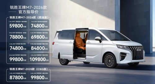 近日,2026款锐胜王牌M7正式上市,新车在秉承核心优势的基础上,精准锚定用户核心需求,完成全维度焕新升级。继纯电版上市之后,燃油、CNG两种动力车型也于12月31日重磅上市,售价区间5.98-10.98万元。此次升级不仅让新款车型的产品实力全面进阶,更实现了对不同消费群体需求的精准满足,为每一位用户提供更具诚意的优质之选。
