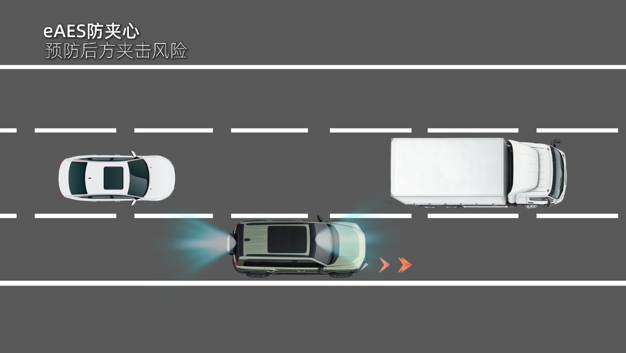 针对春运高速易遇的前车急刹、后车紧逼的“夹心碰撞”风险,OTA升级后新增的eAES防夹心功能化身“安全卫士”,当面对前车急刹,车辆速度快速下降,且后方车辆快速逼近存在追尾风险时,系统监测到旁侧车道具备变道条件时,自动规划最优避险路径,辅助车辆平稳变道,让用户面对突如其来的高速拥堵,行驶更具安全感。