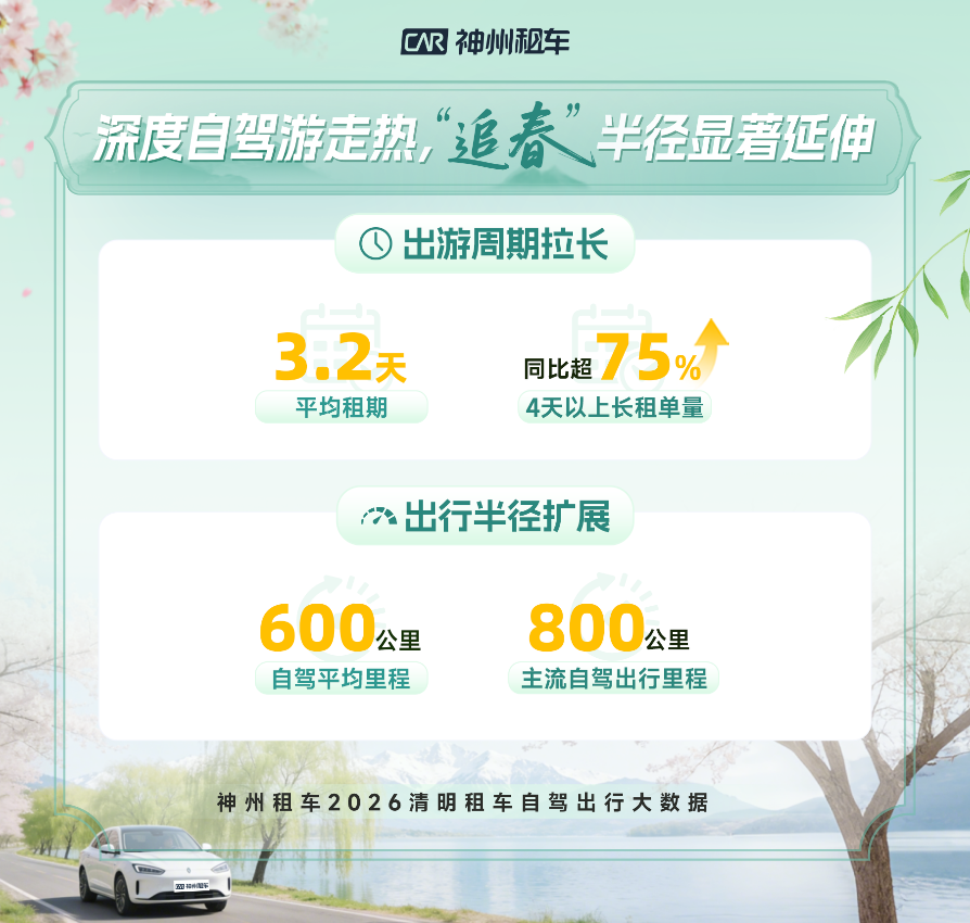 “春季黄金周”大幅激发深度游热度。神州租车清明出行数据显示,用户平均订单租期突破3天,其中租期4天以上的长租订单同比上涨超75%,用户清明出行方式由短时往返向多日深度体验转变。