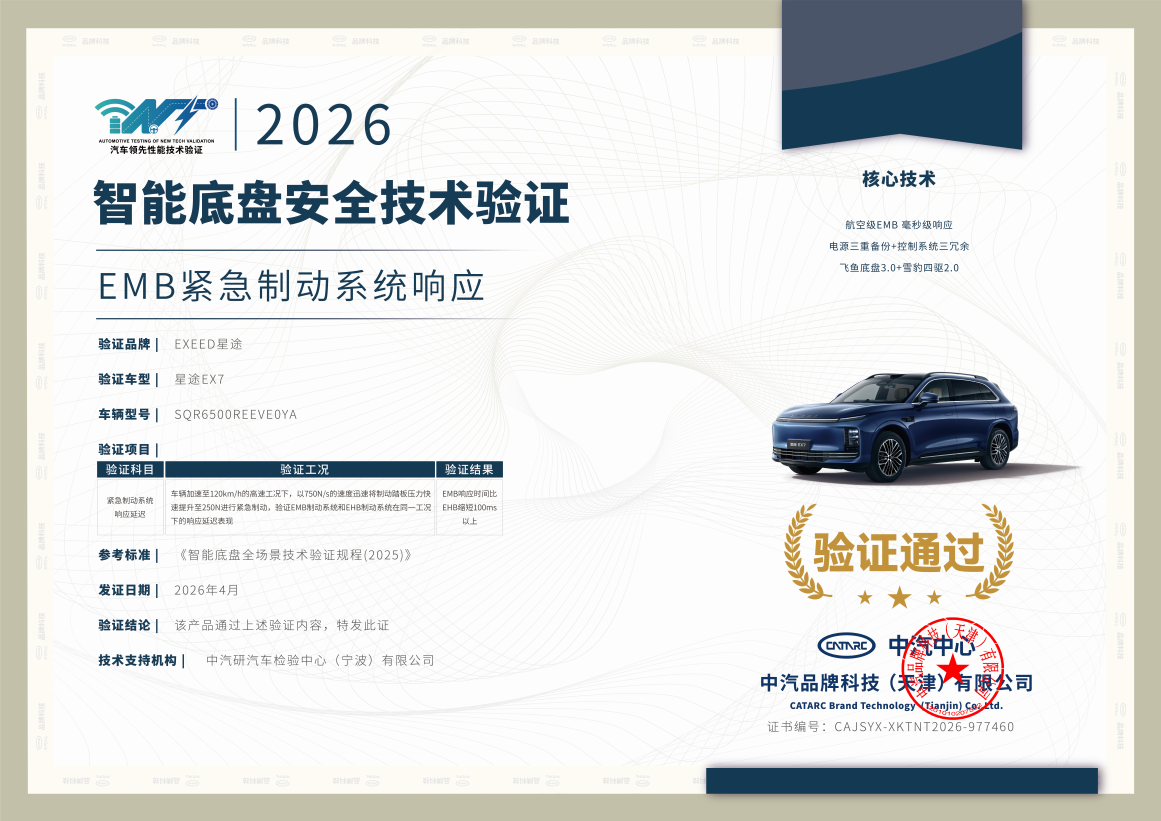 写在最后:成绩只是锦上添花,开创才是核心价值,技术只是支撑手段,守护才是终极目标。星途EX7针对EMB开创的系列测试规则,承载着中国汽车品牌推动行业进步、守护全球驾乘者安全的责任与担当。未来,星途也将持续以创新为驱动,引领中国汽车工业在安全领域实现更高质量的发展,每一位用户都能在每一次出行中,感受到技术带来的极致安全与安心,让“中国标准”的安全理念,成为全球汽车安全的新标杆。