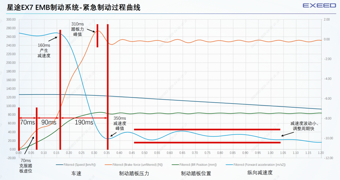而在“绝境逢生”环节,则通过人工干预,致使星途EX7左前右后双轮爆胎、小电瓶断电,但星途EX7基于EMB极速响应+四轮独立制动能力,依然可以进行可控的120km/h紧急制动。“双轮制动”环节在拆除了左前右后制动卡钳,仅保留两个轮胎制动情况下,星途EX7依然可以实现大到0.5g的紧急制动能力,制动过程不甩尾,不失控,不偏出3.5米车道,平稳刹停,实现了人类汽车历史上首次极限突破。