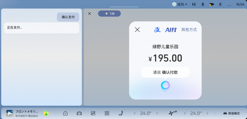 支付宝AI付车载版并不是简单打通了车内支付环节,而是借助AI大模型技术实现了自然语言驱动支付。基于斑马元神AI的自然语言理解能力,车主通过语音即可发起并完成支付,比如“帮我买两张电影票”,AI与车主确认订票信息后即可一句话完成支付,无需多余步骤。